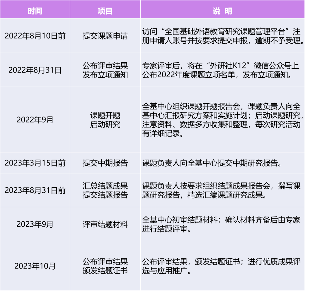 申报对象:全国基础教育阶段学校在职外语教师;课题负责人有组织开展小课题研究的能力;课题研究鼓励多人参与和团队合作,核心成员不超过5人(不含课题负责人)。