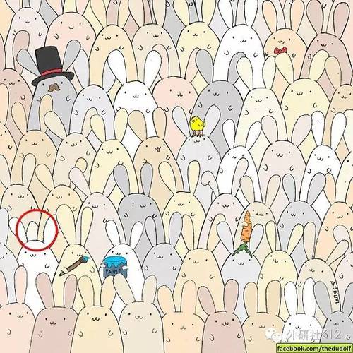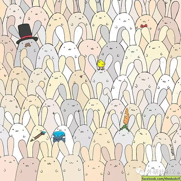 怎么样,是不是眼睛都花了?哈哈,千万别被图中的礼帽、胡萝卜、小黄鸡和油漆桶转移了注意力!真正的复活节蛋在一只白兔子的脑袋后面,看起来就像是一只耳朵!