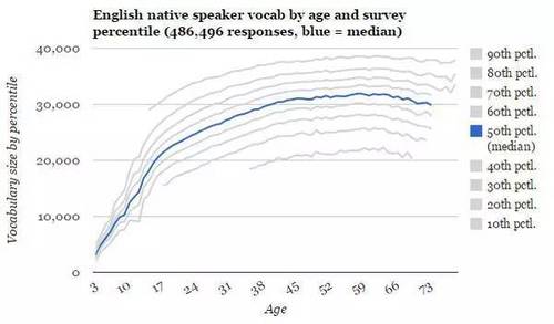 下 面这张表是美国母语人的分年龄的词汇量总表(English native speaker vocab by age and survey percentile),我们看横轴是年龄,竖轴是词汇量,从1万-4万。如果我们取中间数,就是蓝色那条线,大家看母语孩子10岁的时候,词汇量大概在 1万左右,到17岁就大概在2万左右。