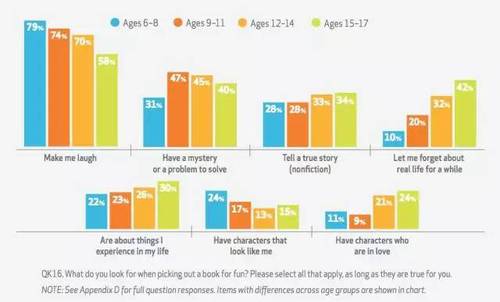 下面这些表格是另外一些报告,就是孩子喜欢什么样的书,挺有意思的。大家可以仔细研究一下,我不详细讲了。比如说70%的孩子认为,他们喜欢什么样的书呢?make me laugh,让我笑的书。下面的几张表大家自己看一下。