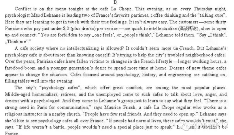 如阅读题D“心理咖啡馆”这篇阅读材料,它的第一段给出心理咖啡馆的主要作用:“人们试着展示自己的真实想法”。