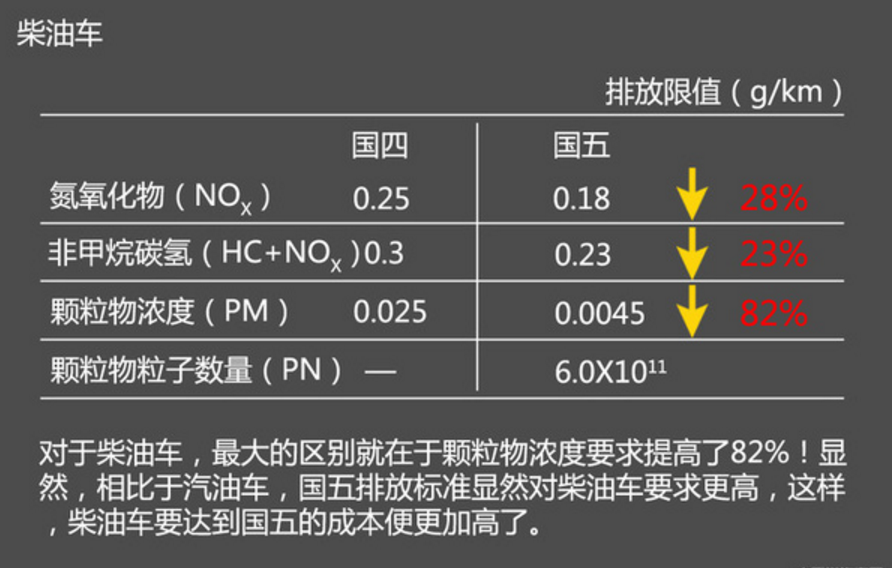 此外国五还加入了颗粒物粒子数量(PN)和除甲烷以外的碳氢化合物(NMHC)的标准。汽车尾气中的一氧化氮(nitrogen monoxide)的含量将减少40%,PM2.5含量也会相应下降。小编认为,近年来,我们在控制机动车尾气排放问题上日益改善,逐渐达到了欧洲最优蓝标车(蓝色环保标志车)(blue label vehicles)标准。