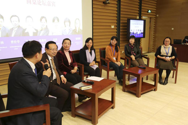 外研社综合语种出版分社社长彭冬林主持圆桌论坛环节,苏州科技城外国语学校总校长曹伦华、石家庄第二外国语学校校长宋素金、北京外国语大学附属外国语学校副校长张继军、成都实验外国语学校副校长沈欣、天津外国语大学附属外国语学校校长助理王桢、泰州民兴实验中学教学处主任秦维维,就“一带一路”、国际化人才和多语种教育三个关键词进行深入的探讨。