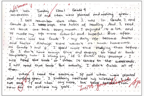 写作部分教师让学生讨论作者的写作目的以及为了实现写作目的作者是如何做的。学生总结出作者使用了“举例子”的方法,教师接着让学生再举一个生活中的例子,与同伴讨论并写下来,然后用多媒体展示学生作品。如图3所示学生作品,共包含两个自然段,第一段介绍了学生自己读书的实例,第二段点明文章中心句“Life is too short for ifs and whens”。