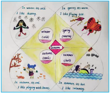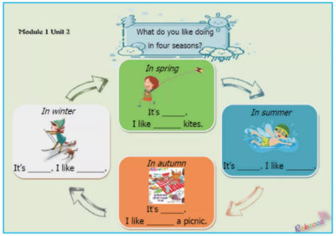 以外研版小学《英语》(一年级起点)第四册Module 1 Unit 2一课为例。该模块的功能话题是Weather,教师要引导学生运用语言结构What’s the weather like? It’s…来问答天气情况;并运用What’s the weather like here in spring / summer / autumn / winter? It’s… What do you like doing in spring /summer / autumn / winter? I like doing…来问答不同季节的气候特点以及在不同季节喜欢做的事。