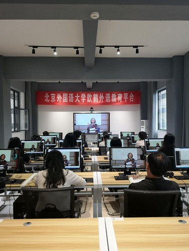 自2013年承担对口鹤庆县的专项扶贫任务以来,北外在“研究咨询、文化艺术下乡、干部师资培训”三大专项扶贫任务上持续投入。经过多年积累与探索,北外于2019年年中决定,依托鹤庆县图书馆电子阅览室建设“北京外国语大学歆鹤外语教育平台”。该平台配备有一部大尺寸触摸屏会议系统、十六台电脑及二十套桌椅,具有网络交互、音像采集、同屏协作等功能,可以承担现场及远程中小型培训、授课、会议。