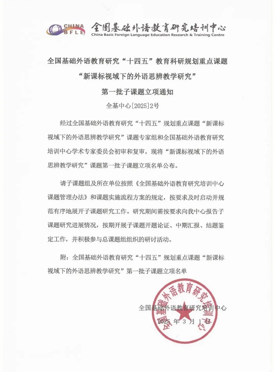 全国基础外语教育研究“十四五”教育科研规划重点课题“新课标视域下的外语思辨教学研究”(课题编号:QJZD20240701)旨在全面分析新课标背景下外语思辨教学的实践效果与策略。课题自立项以来,受到各地老师的广泛关注。经课题专家组和全国基础外语教育研究培训中心学术专家委员会初审和复审,现将第一批子课题立项名单公布,共计6所申报单位获批立项。