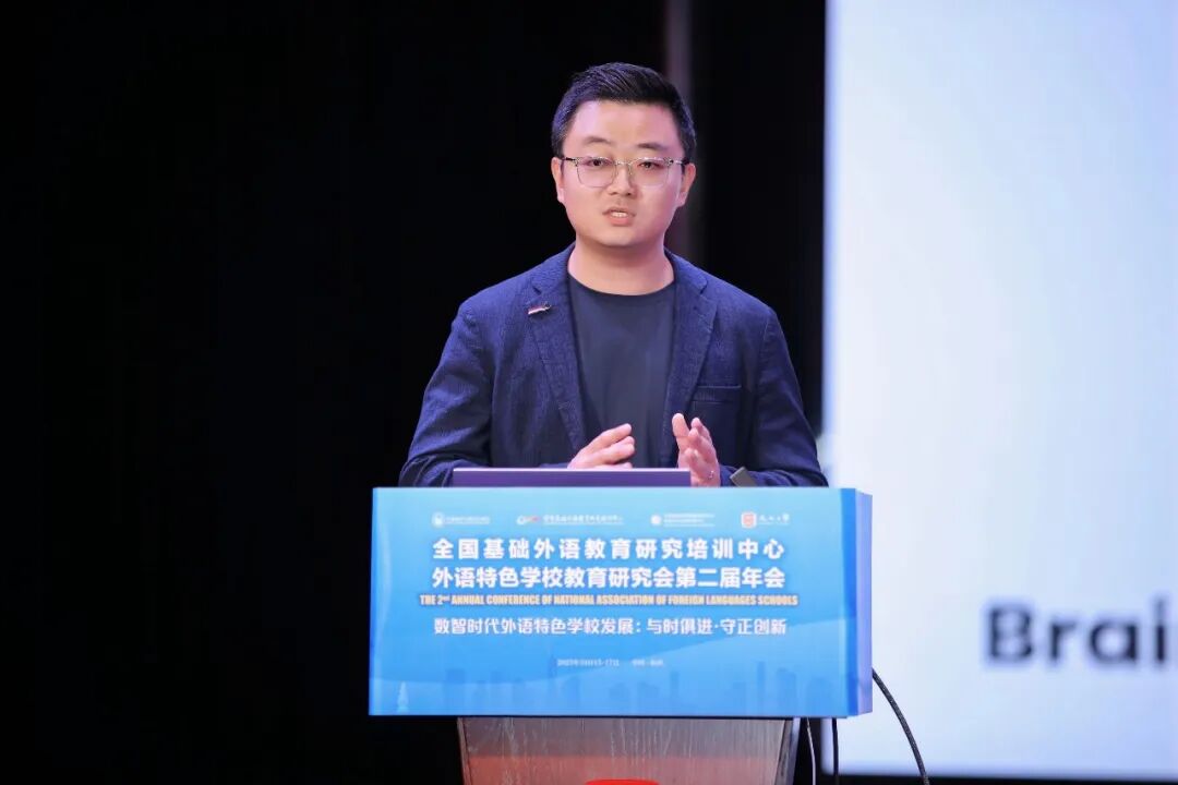 方志明代表承办校致欢迎辞。他指出,近年来杭州凭借强大的创新动力,在人工智能时代占据了领先地位,杭州天元公学正是在这片充满创新精神的沃土中不断成长与发展。学校积极响应国家教育数字化战略行动,提出打造OTO教育标杆学校愿景,以“天元大脑”为载体,解决“教考评管营”目标诉求,通过智能设备、在线平台及数据分析系统实现教学全过程数字化管理,推动教育从“经验驱动”迈向“智能赋能”。本次大会是杭州天元公学学习交流的宝贵机会,学校将与全国同仁共探数智时代教育新模式,努力为全国外语教育发展贡献“天元智慧”。